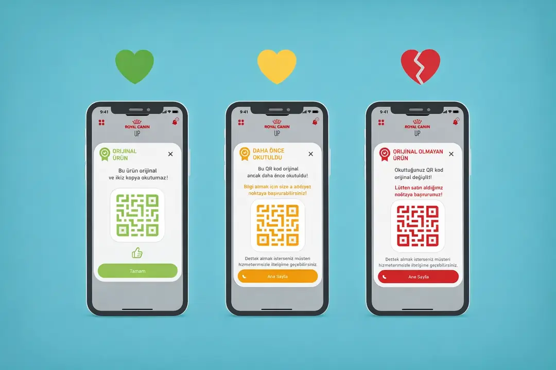 Dikkat! Orijinal QR kodlar sizi bir web sitesine yönlendirmez. Doğrulama işlemi sadece Royal Canin Up uygulaması içinden yapılır. Bir web sitesine yönlendiriliyorsanız, o kod sahte olabilir; hiçbir linke tıklamayın.