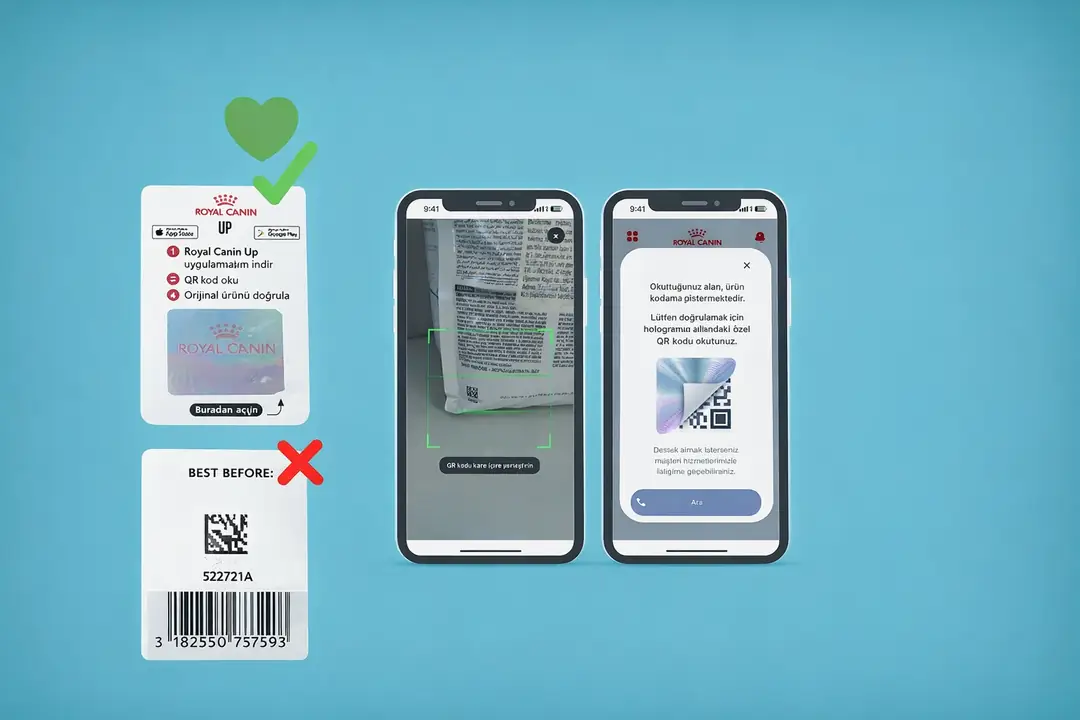 Royal Canin, ürün güvenliğini en üst seviyeye çıkarmak için paketlerine kopyalanamaz hologramlı etiketler ekledi. Bu sistem sadece bir güvenlik önlemi değil, aynı zamanda ürünün fabrikadan evinize gelene kadarki dijital kimliğidir.